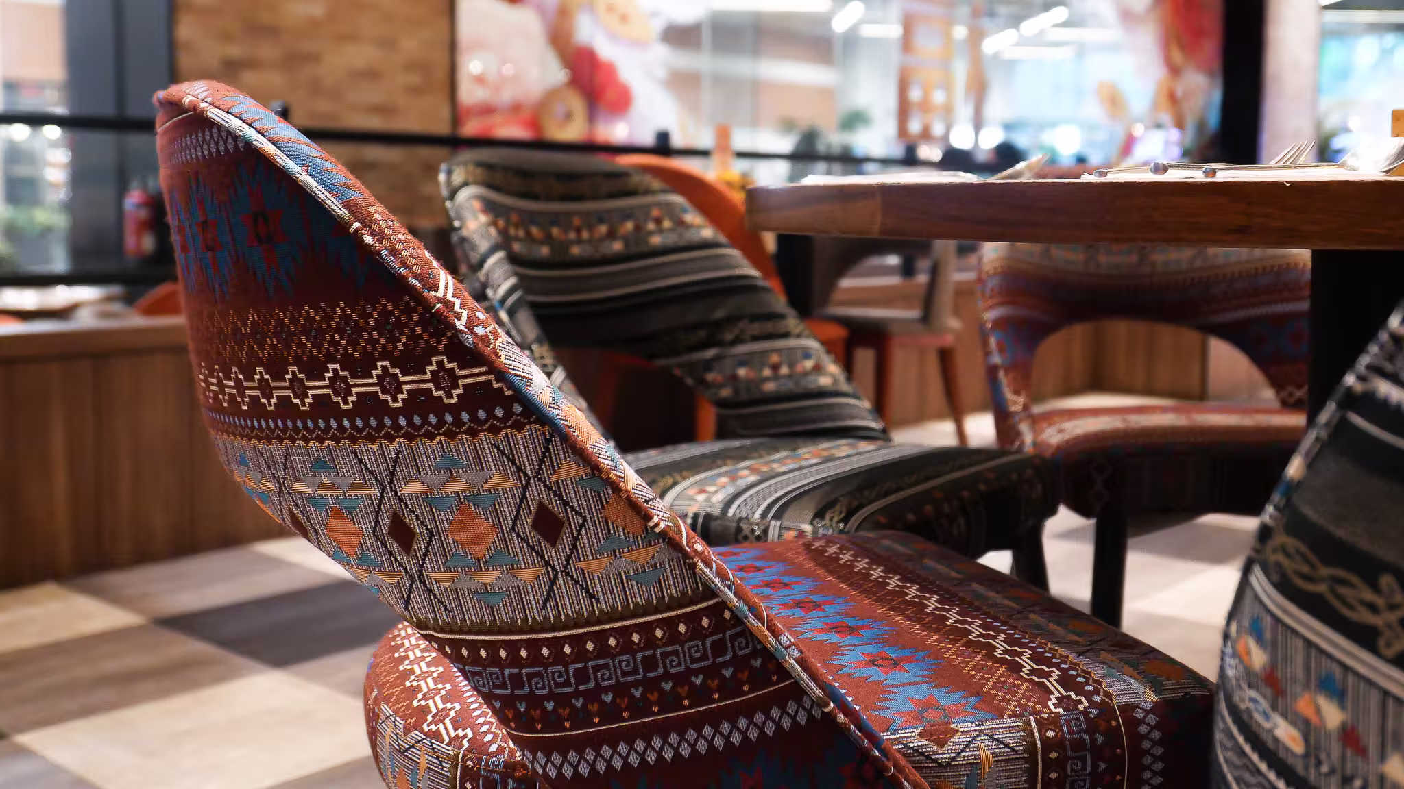 Dressed in deep blue and red hues, these indoor dining chairs are arranged in alternating colors to create visual interest throughout the restaurant. Beyond their vibrant fabrics, the chairs feature a dark wood grain that harmonizes with the restaurant’s wood accents, allowing the bold oranges, reds, and blues in the space to truly pop.